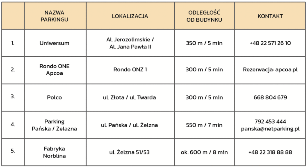 Z myślą o komforcie naszych najemców oraz ich codziennym funkcjonowaniu w centrum Warszawy, przygotowaliśmy zestawienie dostępnych miejsc parkingowych w bezpośrednim sąsiedztwie budynku AMEW. Wiemy, jak istotna jest wygoda w zakresie parkowania – zarówno dla pracowników, jak i gości odwiedzających biura. Dlatego dzielimy się informacjami, które mogą ułatwić wybór dogodnej lokalizacji. W promieniu kilkuset metrów od budynku znajdują się m.in. parkingi: Uniwersum, Rondo ONE Apcoa, Polco, Pańska/Żelazna oraz Fabryka Norblina. Czas dojścia do naszego budynku nie przekracza 7 minut. Każdy z tych punktów oferuje różne warunki, dzięki czemu najemcy mogą dopasować wybór do swoich potrzeb.Jako gospodarz budynku, AMEW nieustannie dążymy do tego, by wspierać najemców nie tylko poprzez jakość przestrzeni biurowej, ale również poprzez dostęp do praktycznych informacji. Zachęcamy do śledzenia naszych komunikatów – dostarczamy treści, które realnie wpływają na wygodę i efektywność pracy.